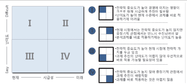 - 전략적 중요도, 비즈니스 성과 및 ROI, 분석 과제의 실행 용이성을 기준으로 고려해 분석 과제의 우선 순위를 설정