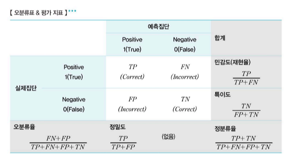 - 분류 분석 후 예측한 값과 실제 값의 차이를 교차표 형태로 정리한 것을 오분류표 혹은 confusion matrix라고 부름